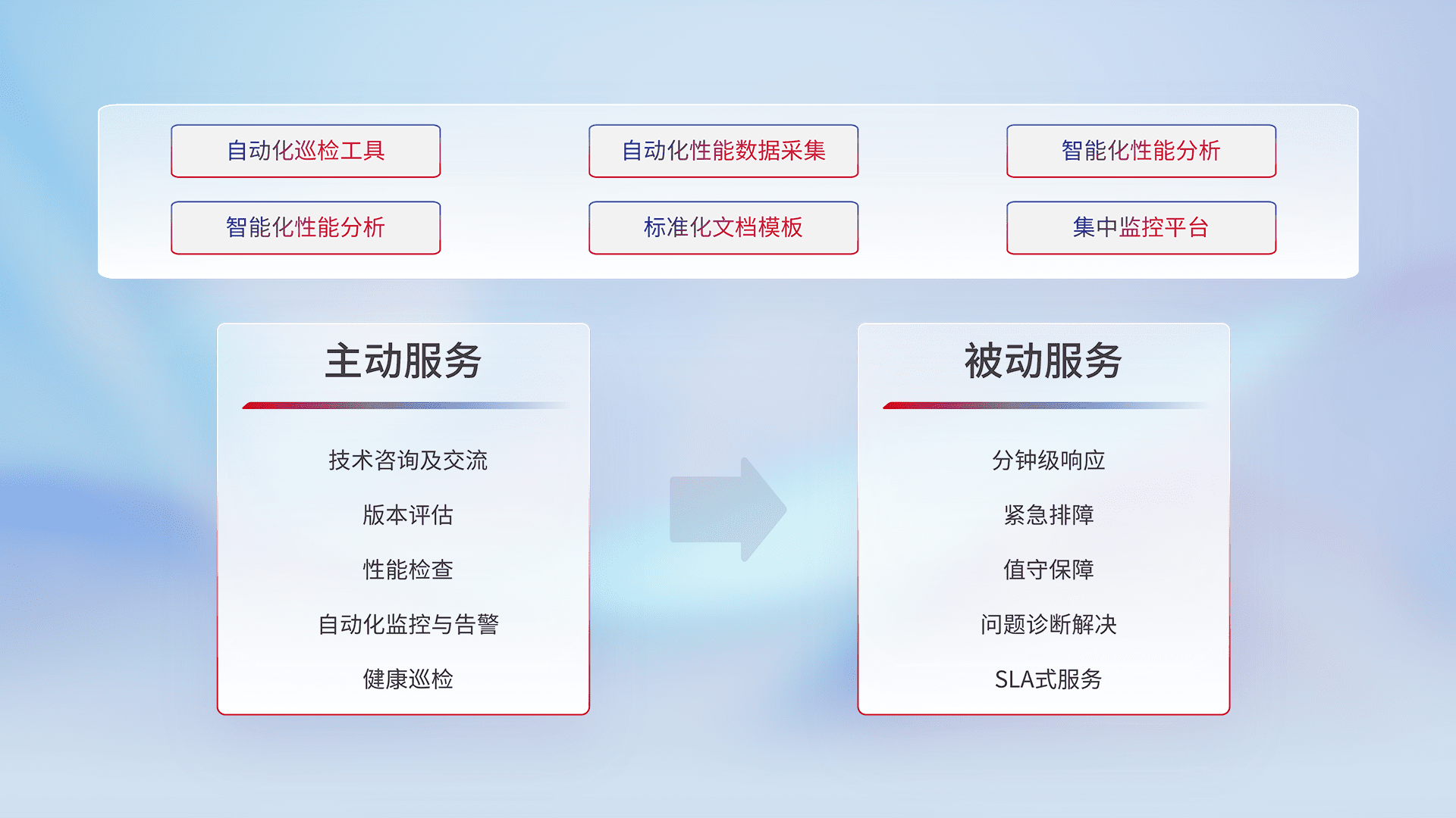 智能化工具和标准化文档,,,保障服务质量,,,,提供主动服务(包含技术咨询、、版本评估、、、性能检查、、、自动化监控与告警、、、健康巡检)和被动服务包含(分钟级响应、、、、紧急排障、、值守保障、、、、问题诊断解决、、、SLA服务)。。。。